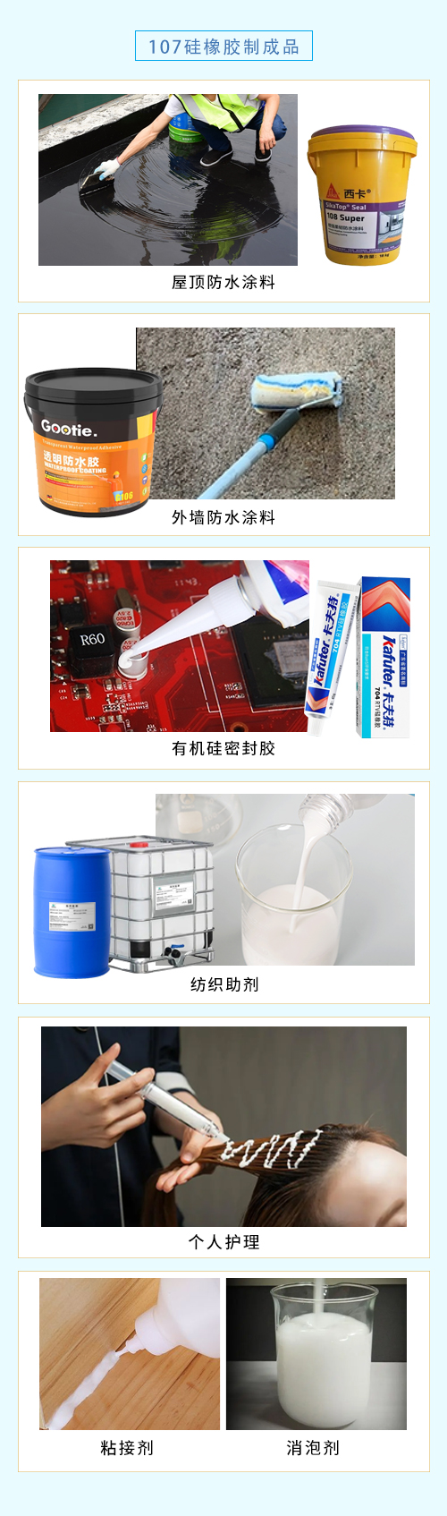 107膠可以直接作為商品使用,也可以作為中間體生產(chǎn)各種縮合型硅橡膠產(chǎn)品。