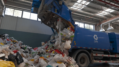 記者跟隨運(yùn)輸車進(jìn)入分揀中心的上料區(qū),車廂內(nèi)卸下的卻不是常見的可回收物——一次性餐盒、一次性塑料杯、牛奶盒、快遞包裝膜、泡沫塑料、舊衣物……乍一看,它們分明是“其他垃圾”(生活垃圾中不屬于廚余垃圾、可回收物、有害垃圾的部分)桶中應(yīng)有之物。但在這里,它們被稱作低值可回收物。