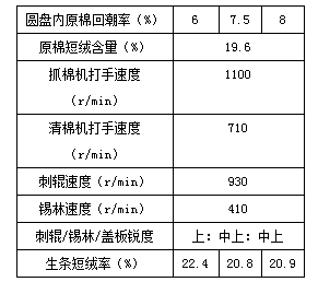 我公司使用的是新疆棉及進口棉,回潮較低(一般在6%以下),難以滿足清棉工序的生產(chǎn)工藝要求,短絨增加較多,因此在生產(chǎn)前要對原棉進行必要的預松包加濕處理,使原棉回潮率提高到7.0%以上,以利于提高纖維強力,減少纖維在打擊分梳過程中的斷裂,生產(chǎn)實踐表明(見表1),原棉回潮率過低,生條短絨增加較多,當原棉回潮率達到7.5%以上時,生條短絨的增長基本趨于穩(wěn)定。因此清棉相對濕度一般要控制在60~65%、梳棉控制在50~55%,以使纖維在生產(chǎn)過程中處于外干內(nèi)濕的放濕狀態(tài),增強纖維的柔軟性和抗打擊能力。清棉工序原棉的回潮率過小,棉纖維脆弱易被打斷,落棉增加,而短絨增加會直接影響成紗強力。若回潮率過大則不利于開松除雜,纖維易產(chǎn)生束絲。梳棉如相對濕度偏高,則會產(chǎn)生分梳困難、棉結增加、除雜效率下降、斷頭增多,如果相對濕度太低,則纖維易脆斷、落棉飛花增多。生條回潮率一般控制在(6.5土0.5)%為宜。