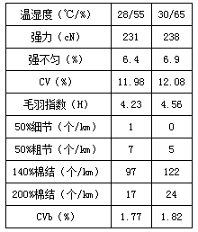 細紗車間的相對濕度要比并粗小一些,以使粗紗在細紗車間保持內(nèi)濕外干的放濕狀態(tài),這樣纖維柔而不易粘附,易加工、導電性好、摩擦力小,對牽伸有利。車間溫濕度的控制與棉纖維的線密度也有關,細纖維比粗纖維的柔軟性要好,且中空度較高,易吸濕,生產(chǎn)細纖維應比生產(chǎn)粗纖維濕度低一些。如果相對濕度過大,紗線與鋼絲圈之間以及鋼絲圈與綱領之間的摩擦力增大,易造成鋼絲圈飛圈,羅拉、皮圈表面附著飛花,皮輥發(fā)粘,繞皮輥,出硬頭等,影響生產(chǎn)。所以要求相對濕度偏小控制,但不宜太小,相對濕度過小易使棉纖維散失,飛花增多,牽伸過程中易產(chǎn)生靜電,纏繞皮輥,成紗毛羽增加,強力下降。細紗一般相對濕度不宜超過60%,回潮率在6.5-7.0%之間,精梳40支純棉紗在不同溫濕度狀況下主要指標見表3。